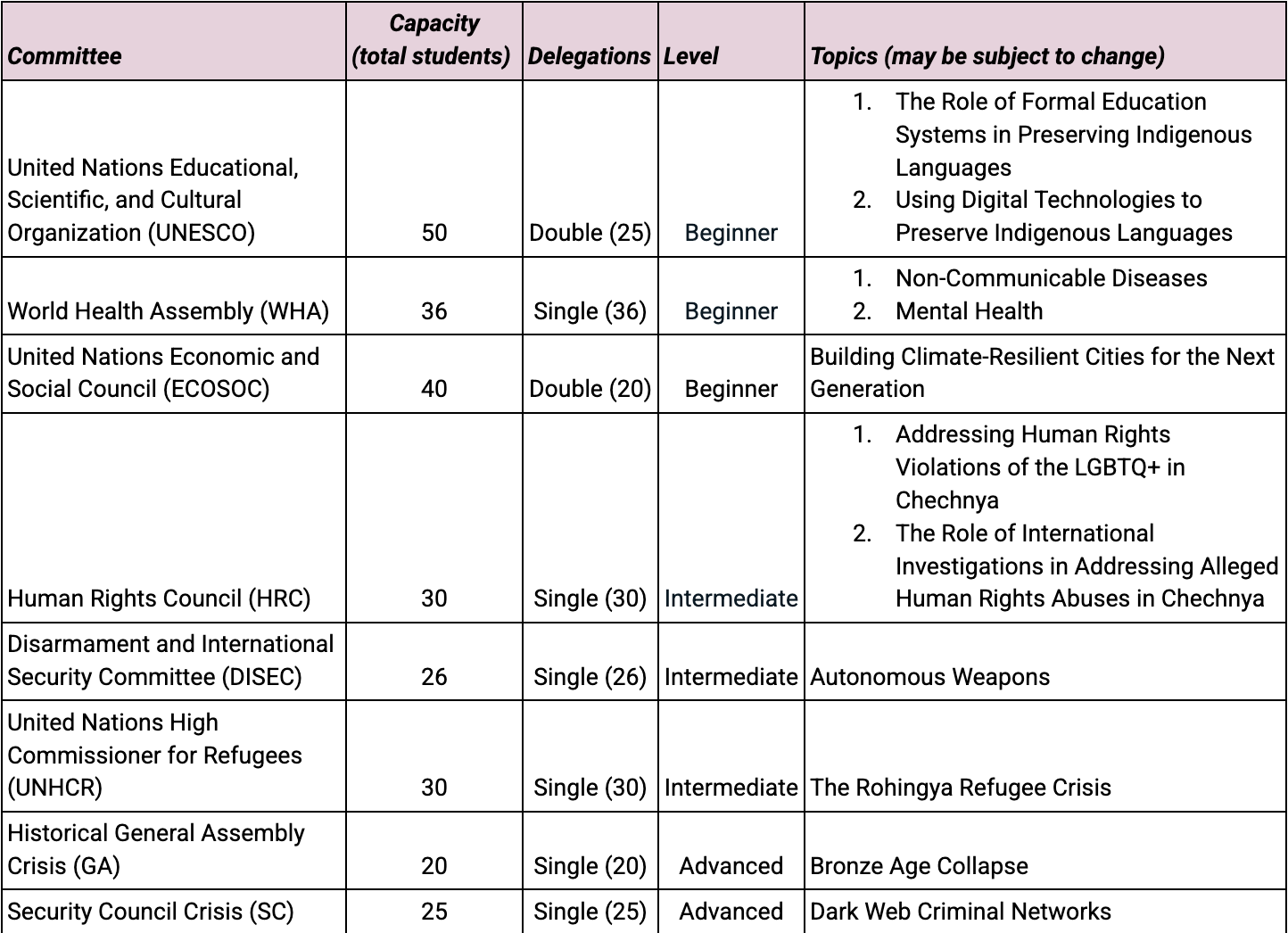 Drop Fees: Delegates who drop after 2/2/26 will be fined 50% of the registration cost. Do not register on the country matrix unless your delegation is prepared to pay and attend the conference! (The country matrix is where final registration numbers are pulled)